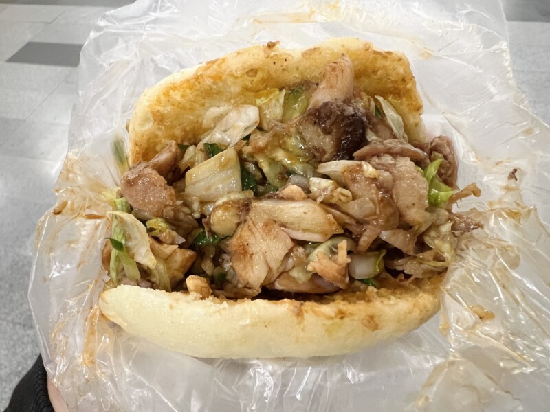 朝食は強風に煽られながら、台味小食というテイクアウトのお店で肉夹馍を買った(≒200円)。こちらは昨日のと違い具材に色々入っていて、これはこれでおいしかった。