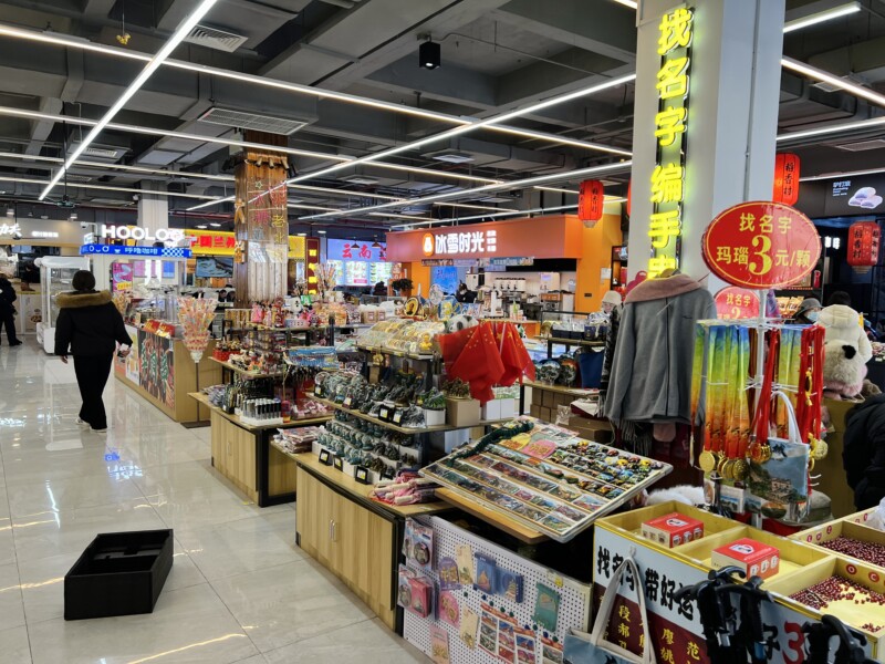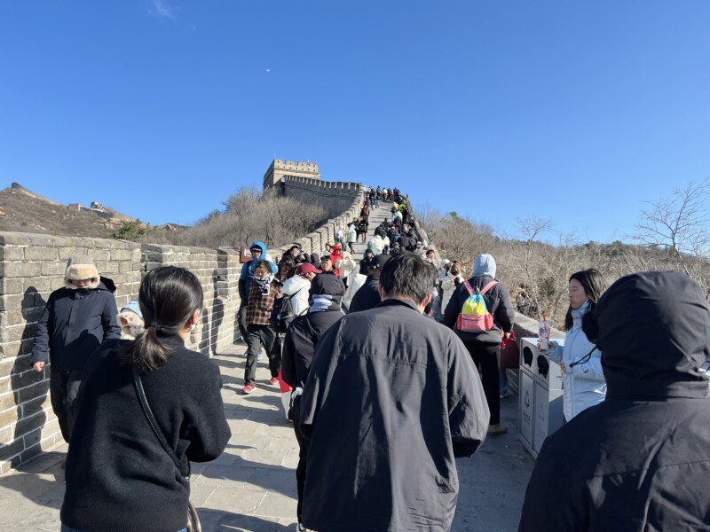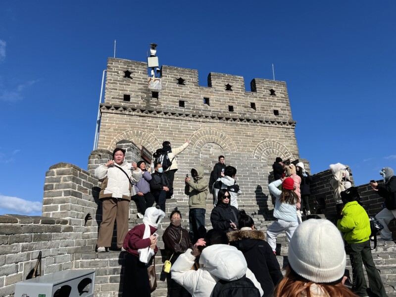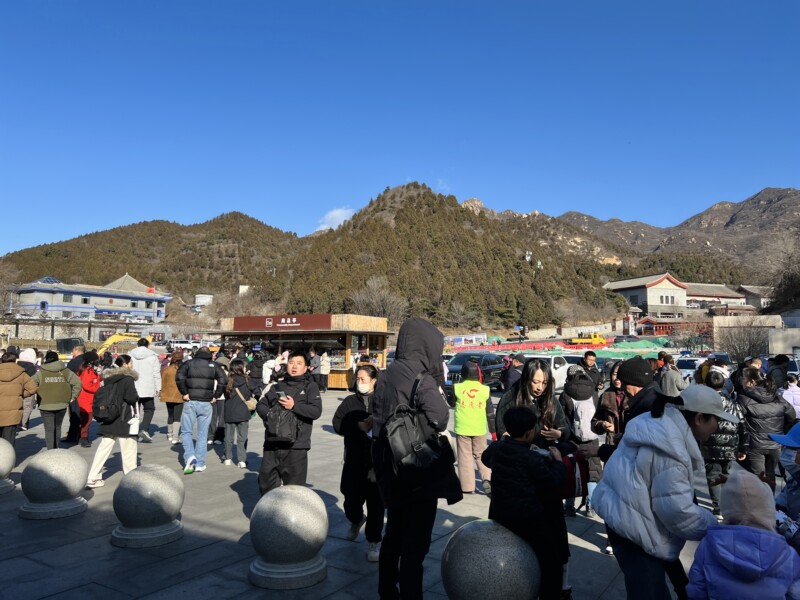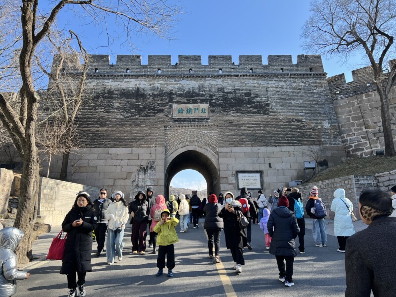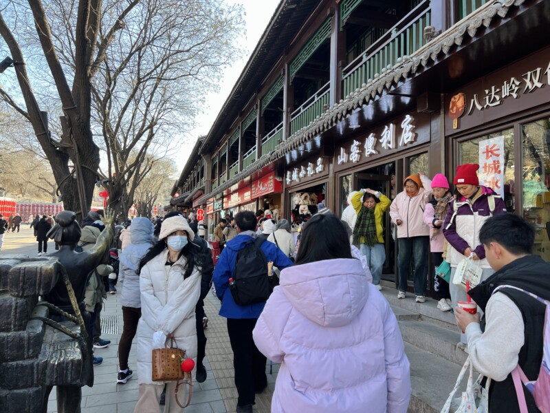 万里の長城へたどり着くまでには、しばらく歩く必要がある。土産物屋や飲食店が立ち並ぶ通りを抜けていく、いわば前哨戦だ。